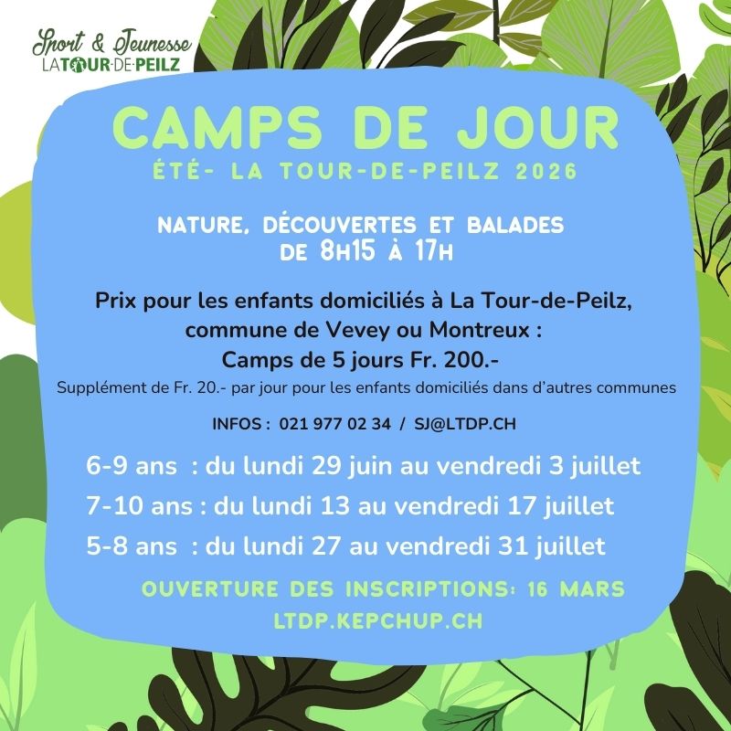 Prix : CHF 200.00* par camp pour les enfants domiciliés à La Tour-de-Peilz, Vevey et Montreux (*supplément de CHF 100.00 pour les autres communes).